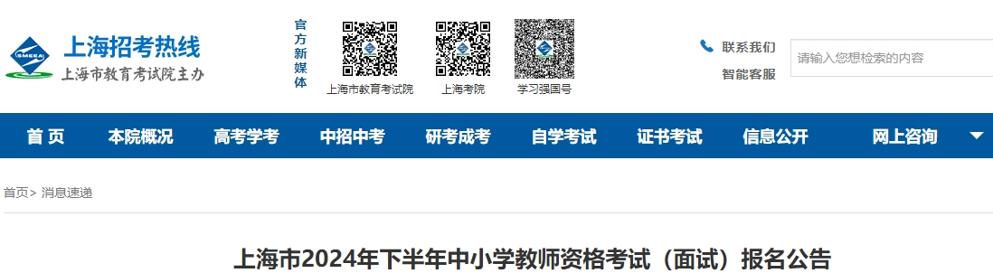 上海市2024年下半年中小學教師資格考試(面試)報名公告
